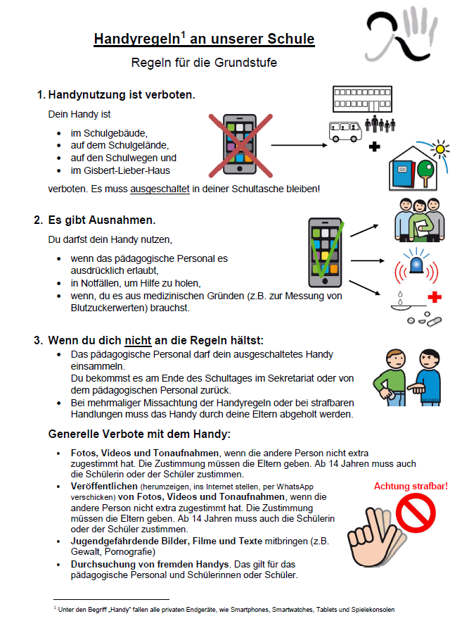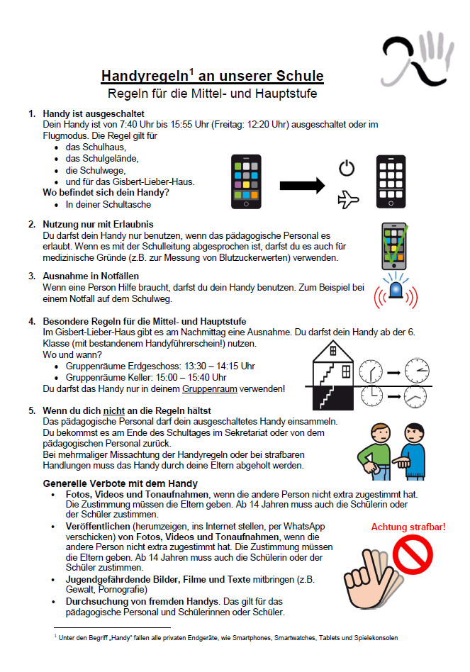 Zum 2. Halbjahr des Schuljahres 2025/2026 wurden die Handyregeln der Freiherr-von-Schütz-Schule überarbeitet und an das neue hessische Schulgesetz zur Handynutzung angepasst. Aktuell wird noch an einem Video zu den Handyregeln in DGS-Übersetzung gearbeitet.